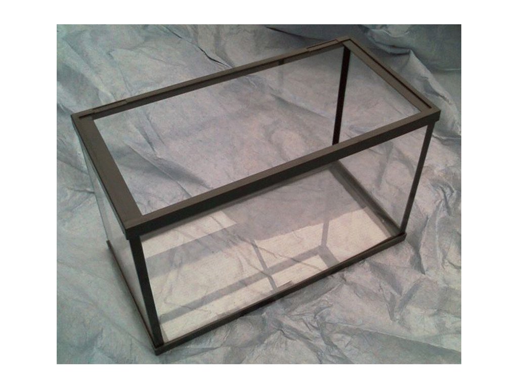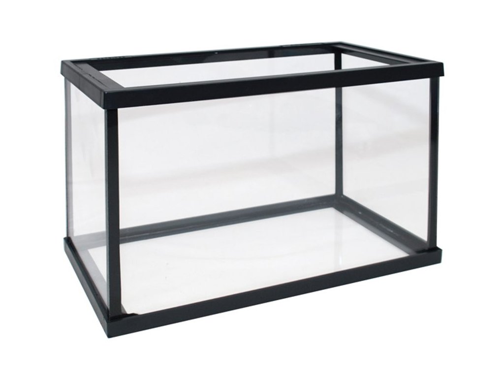 Skleněné akvárium s plastovým rámečkem nahoře i dole.