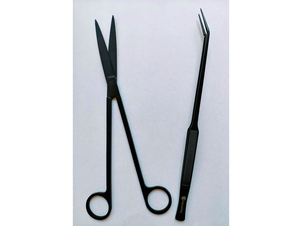 Rovné nůžky a zahnutá pinzeta. Sada určena k stříhání a sázení akvarijních rostlin, pomůcka každého akvaristy či teraristy. Atraktivní černé provedení.